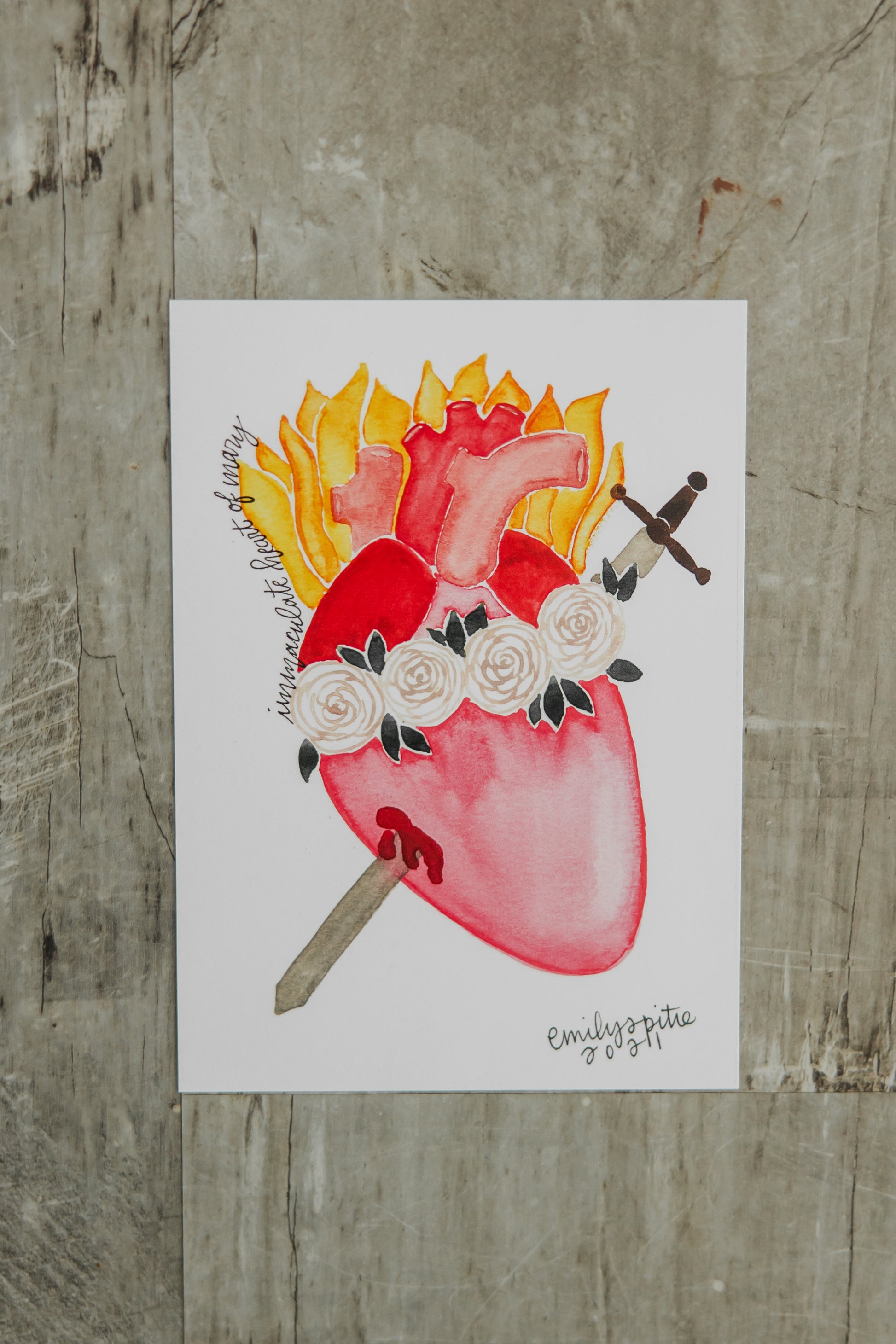 This 5x7 print features an original watercolor of the Immaculate Heart of Mary, a symbol of her purity, maternal love, and deep compassion. She is the patron of all who seek her intercession and guidance.