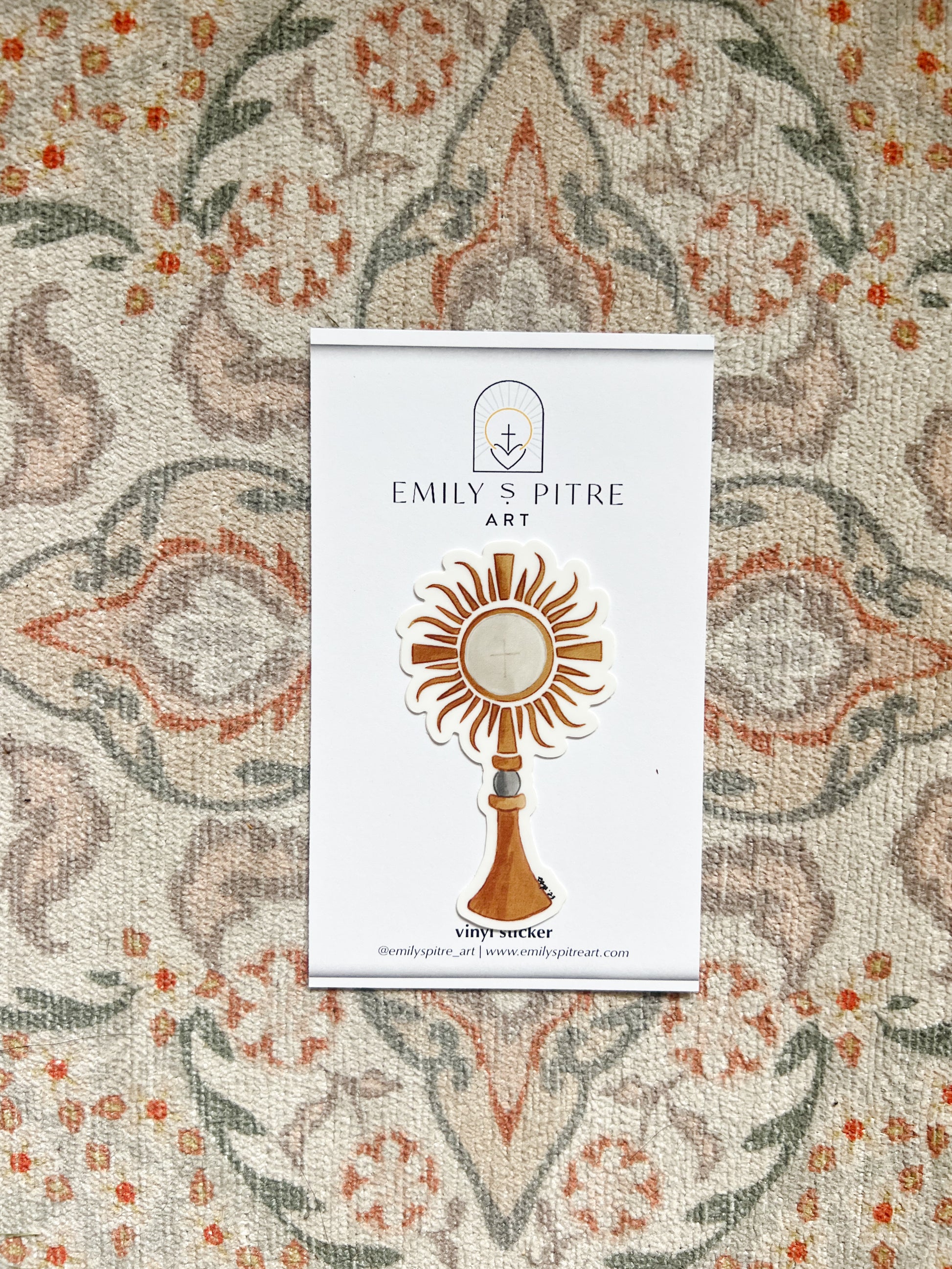 This 3-inch vinyl sticker features a beautiful image of the Monstrance. Made from durable, waterproof, and scratch-resistant vinyl, this sticker is perfect for water bottles, laptops, notebooks, or any smooth surface.