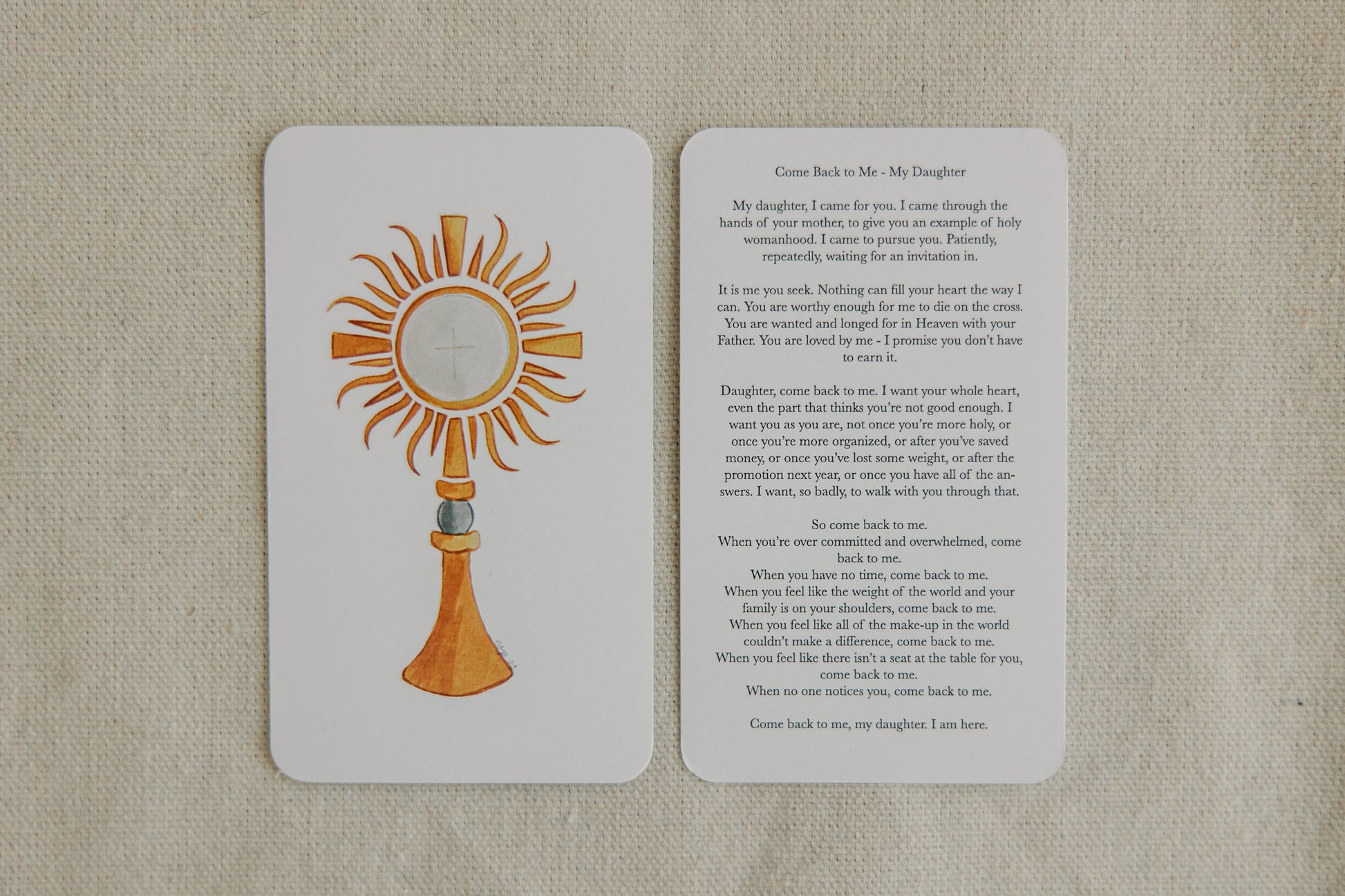 This 4.25" x 2.5" My Daughter Prayer Card features a beautiful image of Jesus present in the Eucharist along with a prayer written by Emily Pitre as a reminder that Jesus is calling for the heart of his daughter. Perfect for personal devotion, wallets, or sharing with loved ones seeking her intercession.