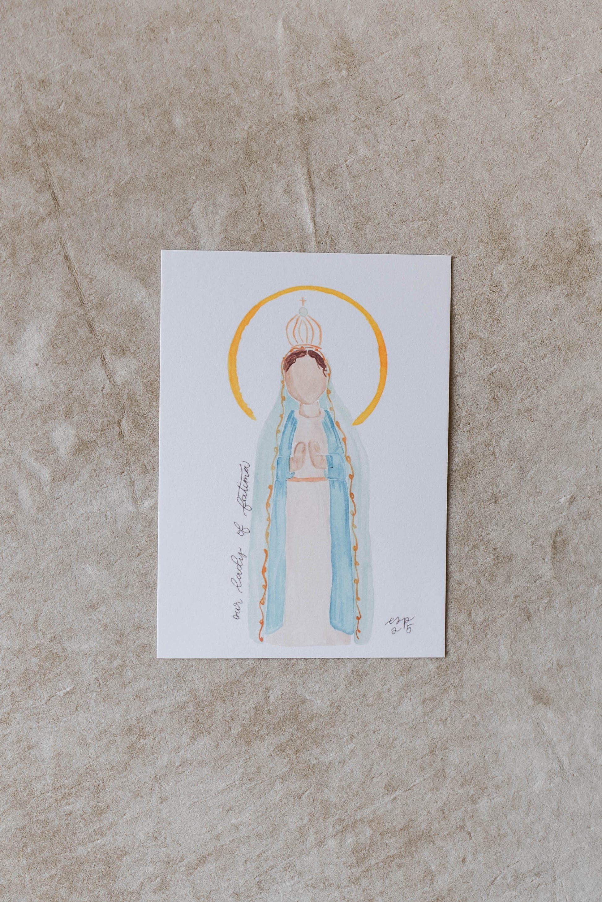 This 5x7 print features a watercolor of Our Lady of Fatima, who appeared to three shepherd children in Portugal with a call to prayer, penance, and devotion to her Immaculate Heart. Feast day: May 13.