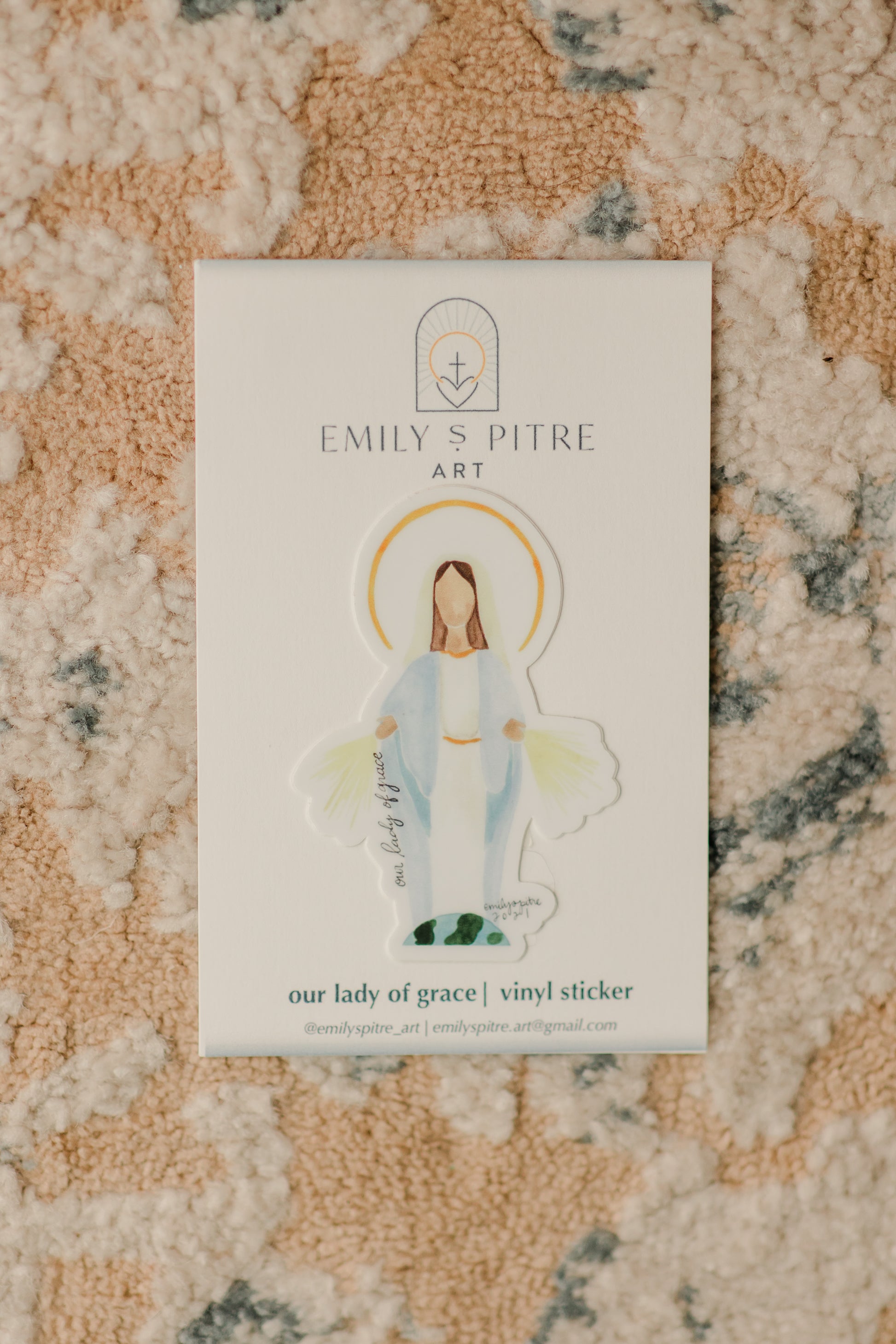 This 3-inch vinyl sticker features a graceful image of Our Lady of Grace, known for her open arms and outpouring of heavenly blessings. Made from durable, waterproof, and scratch-resistant vinyl, it’s perfect for water bottles, laptops, notebooks, or any smooth surface. Our Lady of Grace reminds us of Mary’s role as a channel of God’s mercy and her invitation to trust in divine grace. Carry her image as a symbol of peace, protection, and maternal love. Her Feast Day is celebrated on February 7.