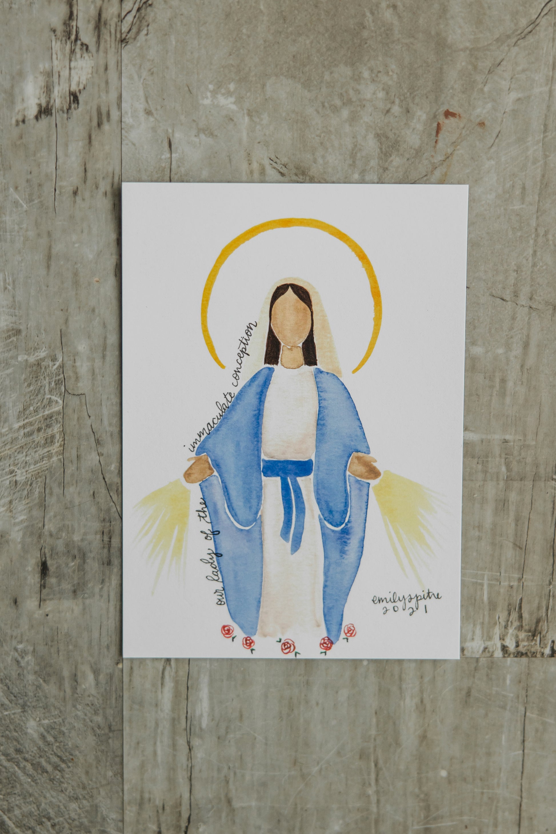 This 5x7 print features Our Lady of the Immaculate Conception, patroness of the United States and model of purity. Feast day: December 8.