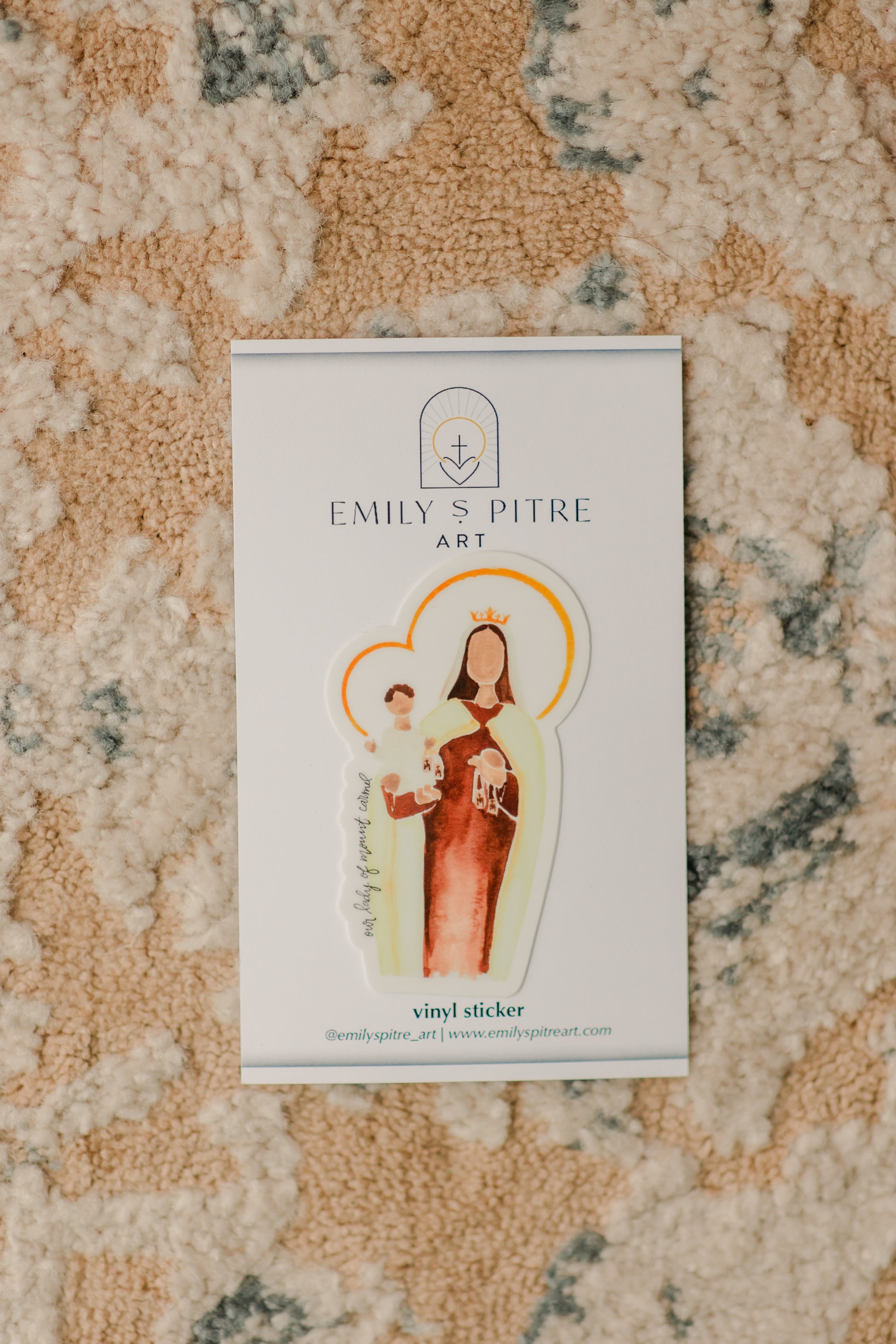 This 3-inch vinyl sticker features a beautiful image of Our Lady of Mount Carmel, a title given to the Blessed Virgin Mary as the patroness of the Carmelite Order. She is often depicted holding the Brown Scapular, a symbol of her protection and a sign of devotion to Christ. She is the patroness of the Carmelite Order, the souls in purgatory, and those seeking Mary’s motherly intercession. Made from durable, waterproof, and scratch-resistant vinyl, this sticker is perfect for water bottles, laptops, notebooks, or any smooth surface. Carry her image with you as a reminder of Mary’s guidance, protection, and love. Her Feast Day is celebrated on July 16.