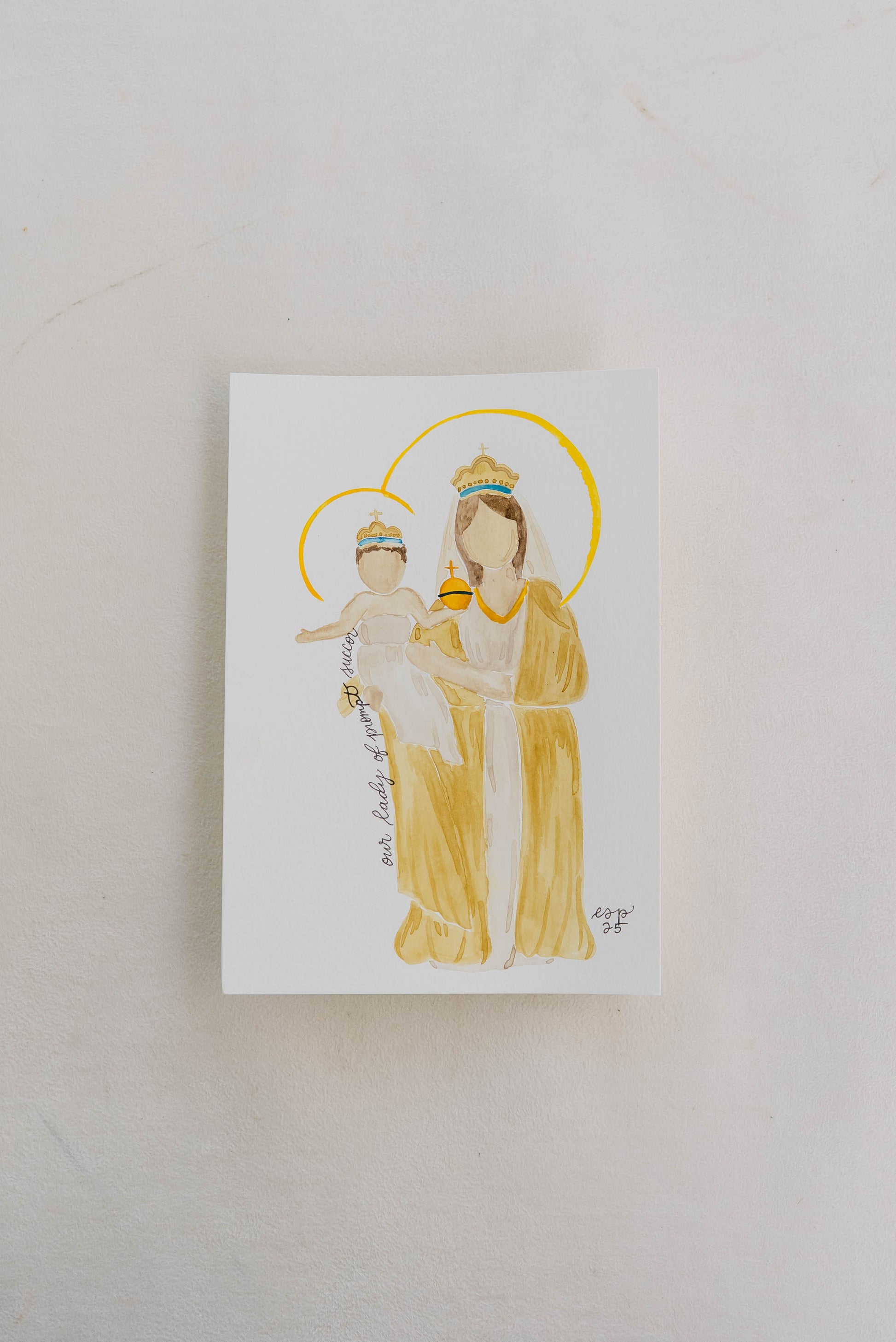 This 5x7 print features a watercolor of Our Lady of Prompt Succor, patroness of Louisiana, invoked for protection during times of disaster and war. Feast day: January 8.