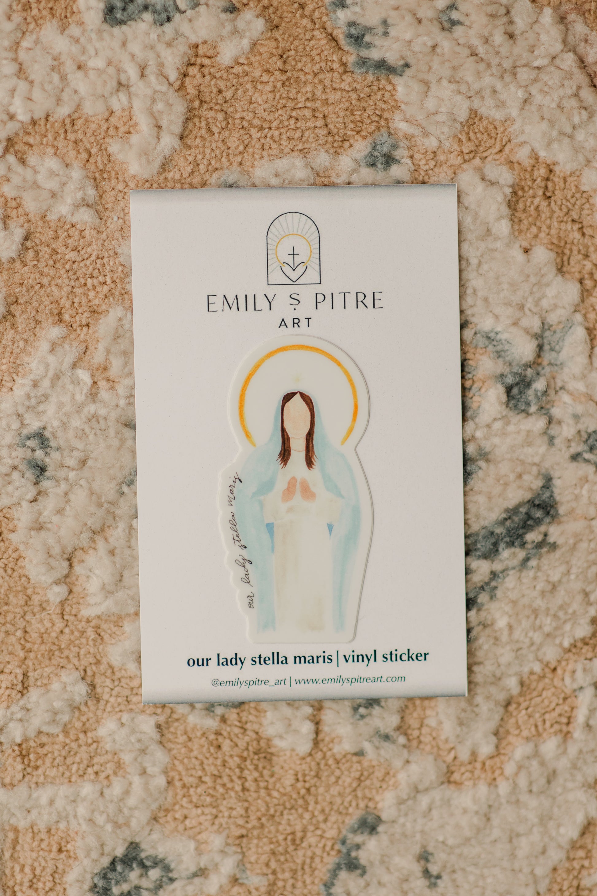 This 3-inch vinyl sticker features a beautiful image of Our Lady, Stella Maris—Latin for “Star of the Sea”—a beloved title of the Blessed Virgin Mary honoring her as a guiding star for all who navigate life’s storms. Traditionally invoked by sailors, travelers, and those seeking direction, she offers peace, protection, and hope amid uncertainty. She is the patroness of seafarers, travelers, and all seeking safe passage through life’s challenges. Made from durable, waterproof, and scratch-resistant vinyl, this sticker is perfect for water bottles, laptops, notebooks, or any smooth surface. Carry her image with you as a reminder that Mary gently leads us to Christ, our safe harbor. Her Feast Day is celebrated on September 27.