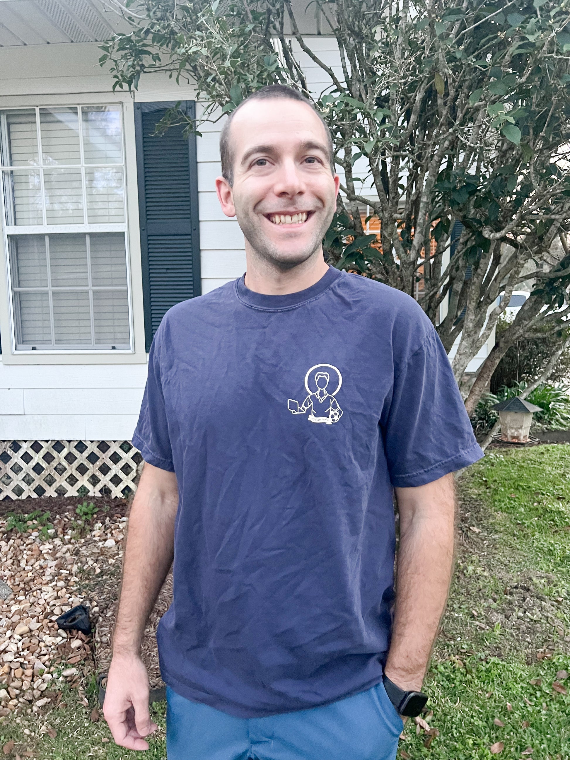 This St. Carlo Acutis short-sleeve t-shirt is printed on a premium Comfort Colors blank for a soft, broken-in feel from the first wear. The rich navy garment is paired with cream ink for a classic, understated contrast that feels both modern and reverent.