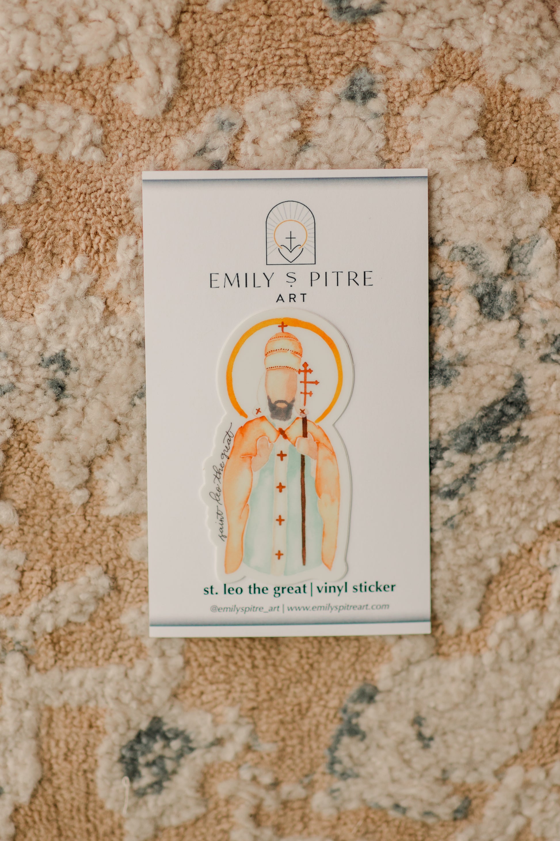This 3-inch vinyl sticker features a powerful image of St. Leo the Great, a pope, theologian, and Doctor of the Church known for his wisdom, courage, and defense of the faith. As pope during times of political instability and heresy, he strengthened the Church with clarity and charity—famously meeting Attila the Hun to protect Rome. He is the patron saint of popes, confessors, and those defending the truth. Made from durable, waterproof, and scratch-resistant vinyl, this sticker is perfect for water bottles, laptops, notebooks, or any smooth surface. Carry his image with you as a reminder to speak the truth boldly, serve with strength, and trust in Christ’s guidance. His Feast Day is celebrated on November 10.