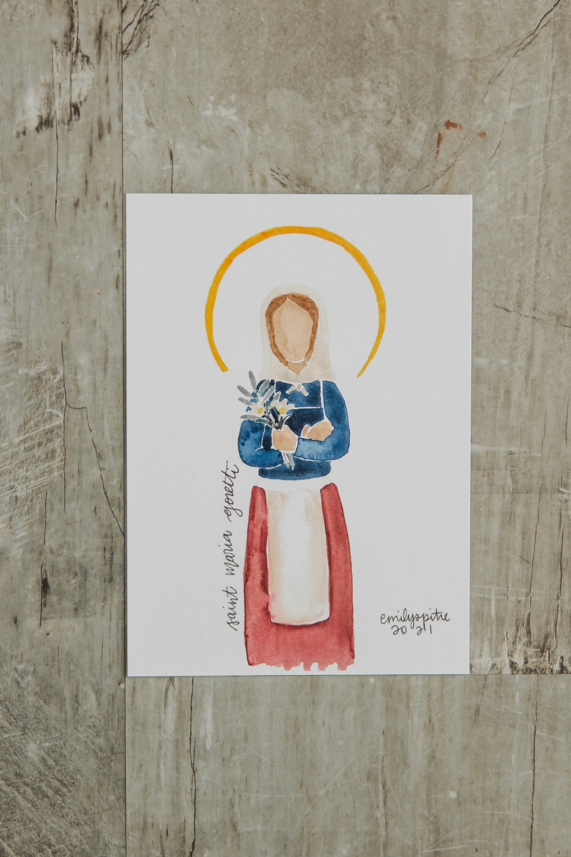 This 5x7 print features an original watercolor of St. Maria Goretti, patron of purity, youth, and forgiveness. Feast day: July 6.