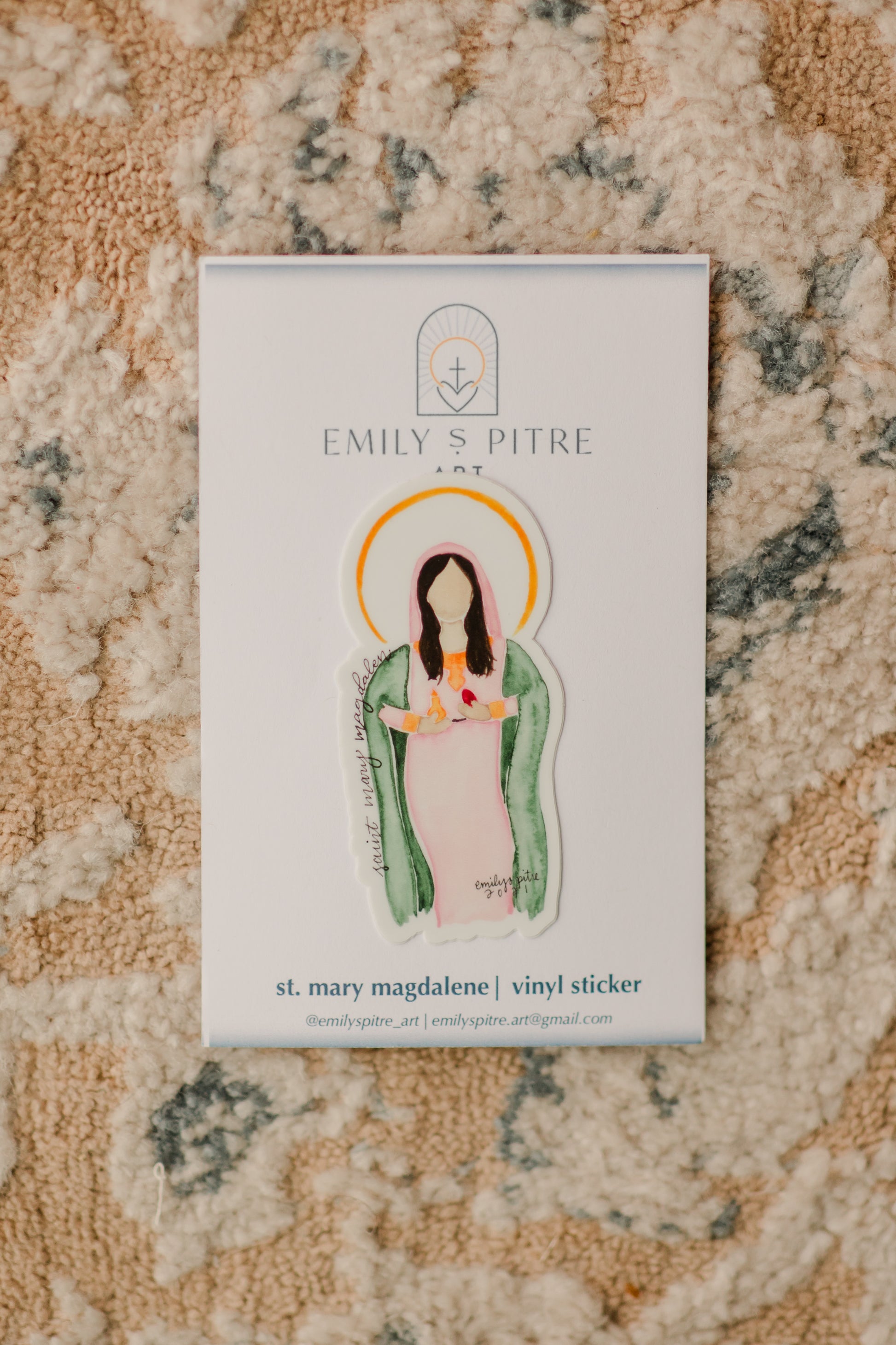 This 3-inch vinyl sticker features a beautiful image of St. Mary Magdalene, one of Jesus’ closest followers and the first to witness His Resurrection. Once healed by Christ, she became a devoted disciple, standing with Him at the Cross and proclaiming the Good News of His victory over death. She is the patron saint of penitent sinners, women, and contemplatives. Made from durable, waterproof, and scratch-resistant vinyl, this sticker is perfect for water bottles, laptops, notebooks, or any smooth surface. Carry her image with you as a reminder of God’s mercy, the power of transformation, and the call to boldly witness the Gospel. Her Feast Day is celebrated on July 22.