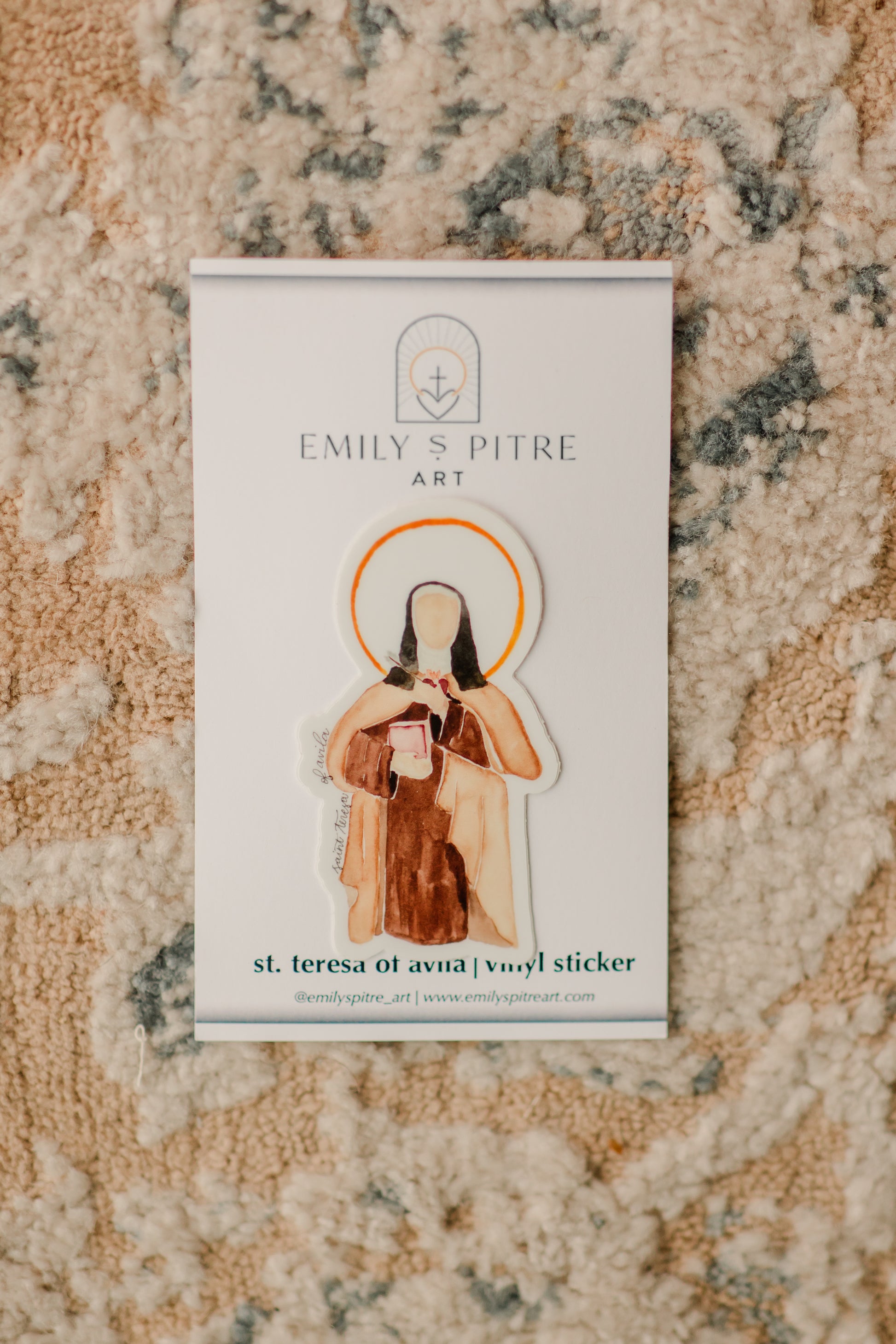 This 3-inch vinyl sticker features a beautiful image of St. Teresa of Ávila, a Carmelite reformer, mystic, and Doctor of the Church known for her deep contemplative prayer, spiritual writings, and bold leadership. She devoted her life to renewing the Church from within, calling others to deeper interior union with God. She is the patron saint of spiritual directors, contemplatives, and those seeking mental and spiritual clarity. Made from durable, waterproof, and scratch-resistant vinyl, this sticker is perfect for water bottles, laptops, notebooks, or any smooth surface. Carry her image with you as a reminder to seek God within, trust in His presence, and persevere in prayer. Her Feast Day is celebrated on October 15.