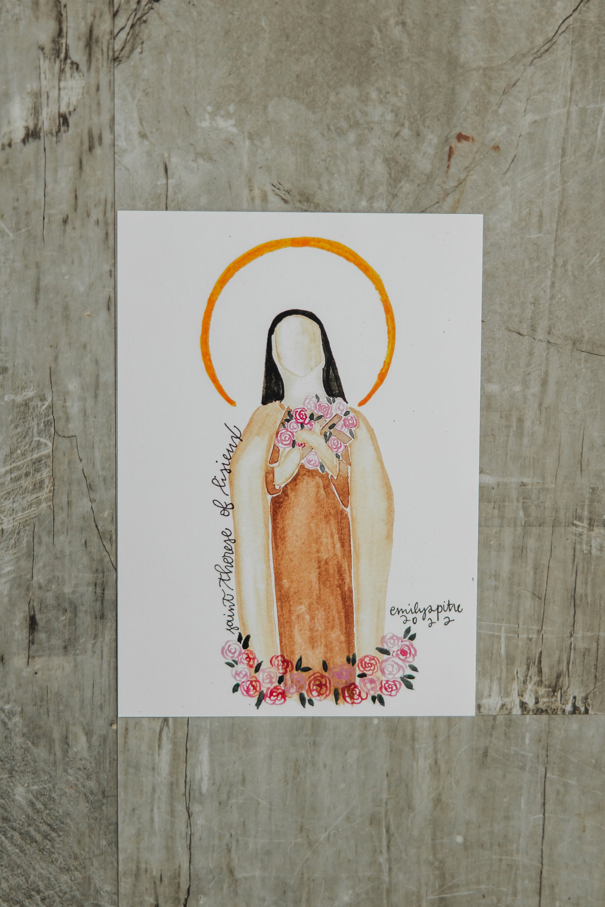 This 5x7 print features a watercolor of St. Thérèse of Lisieux, the “Little Flower,” patron saint of missionaries, florists, and the sick. Feast day: October 1.