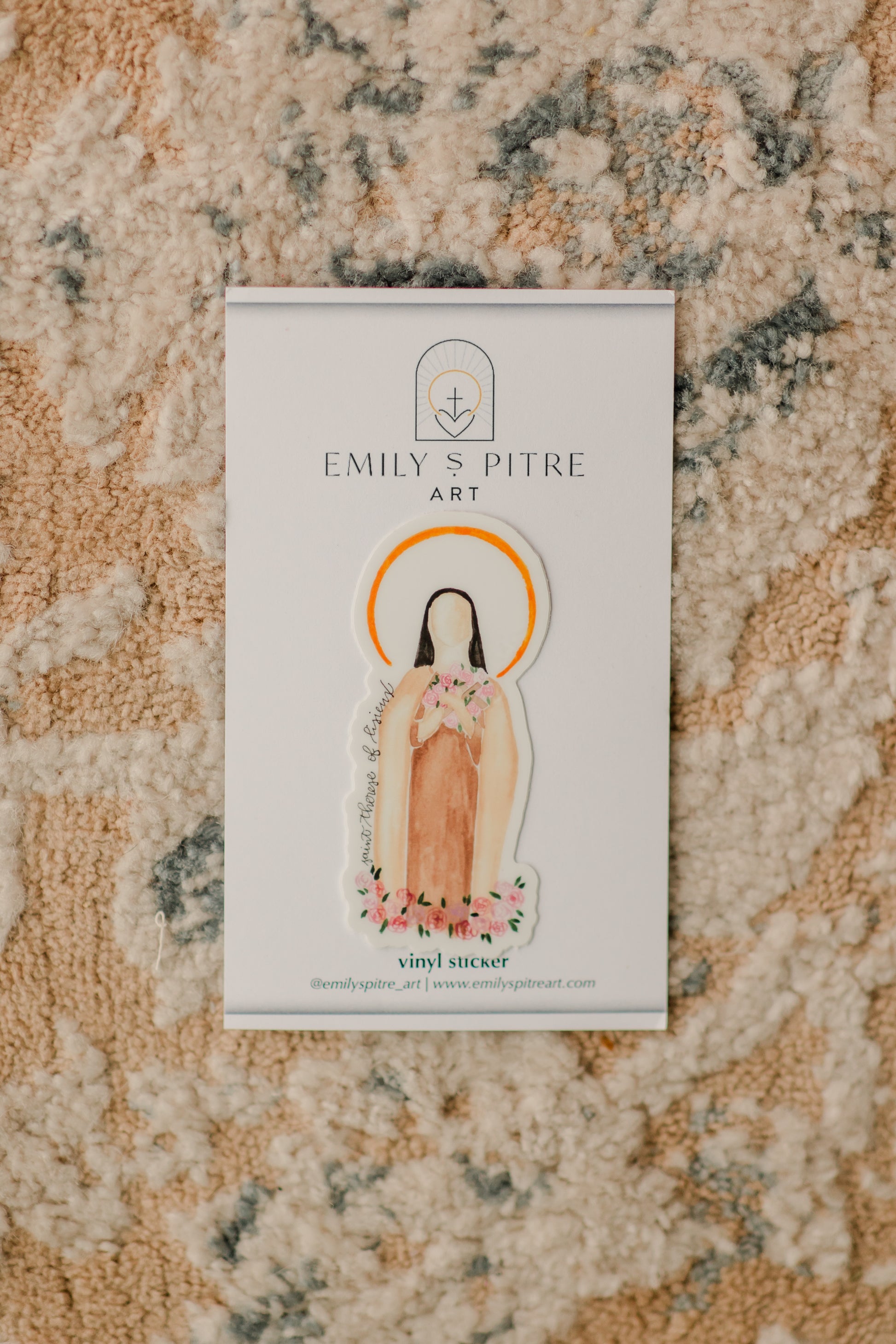 This 3-inch vinyl sticker features a beautiful image of St. Thérèse of Lisieux, also known as the Little Flower, a Carmelite nun whose “Little Way” of love, humility, and trust in God has inspired hearts around the world. Though she lived a hidden life, her deep spiritual wisdom and childlike faith made her one of the most beloved saints of modern times. She is the patron saint of missionaries, the sick, and those seeking simplicity and holiness in everyday life. Made from durable, waterproof, and scratch-resistant vinyl, this sticker is perfect for water bottles, laptops, notebooks, or any smooth surface. Carry her image with you as a reminder that great holiness can be found in small acts done with great love. Her Feast Day is celebrated on October 1.